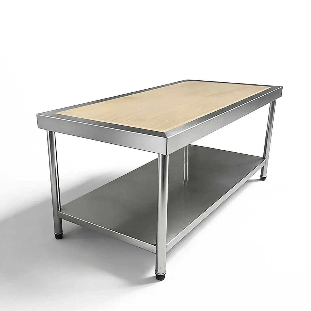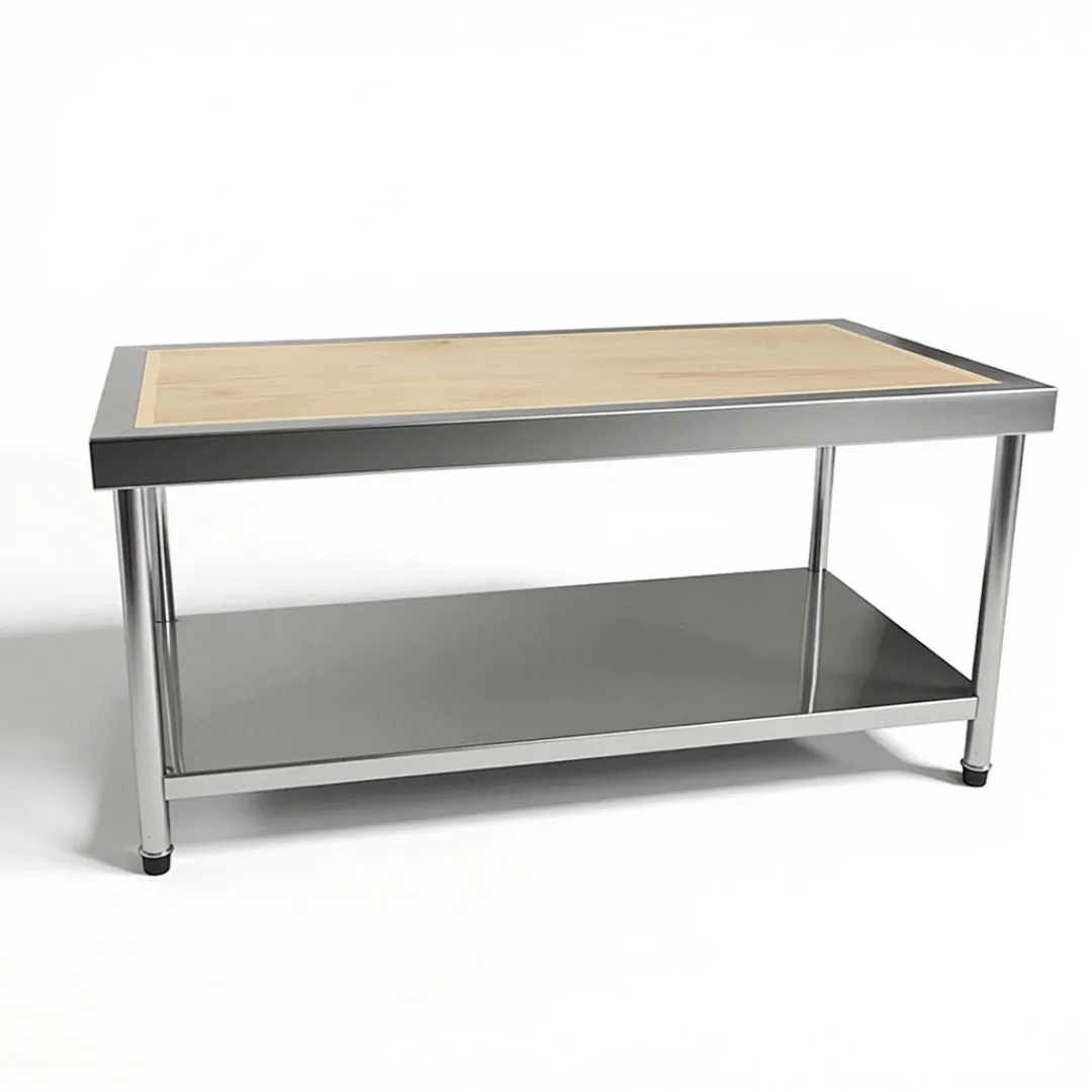 Estetika Alami: Tidak seperti meja kerja logam dingin, bagian atas kayu solid menambah kehangatan dan pesona organik pada dapur, menyempurnakan dekorasi keseluruhan dan menciptakan ruang persiapan yang nyaman.
